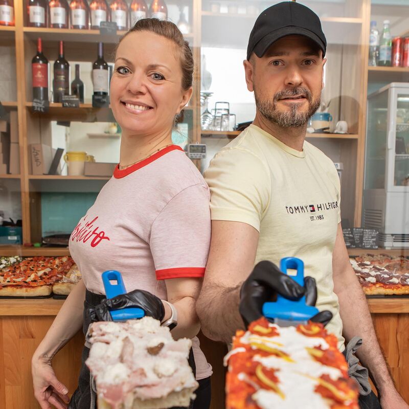 Présentées sur de grandes plaques, nous servons nos pizzas et nos focaccias à la part,
